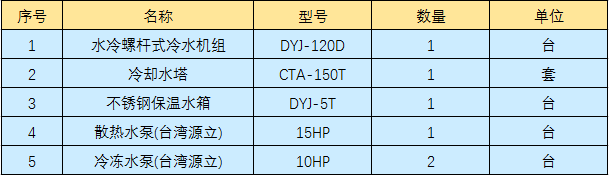 清遠皮革廠壓花機橡膠輥冷卻,通過工廠技術(shù)人員核算,需要配120HP水冷螺桿式冰水機組2臺,客戶直接百度水冷螺桿式冰水機找到東躍進制冷,通過幾天的電話及文字溝通確認,最終訂購2臺120HP水冷螺桿式冷水機組以及輔助設(shè)備,型號及數(shù)量如下表: